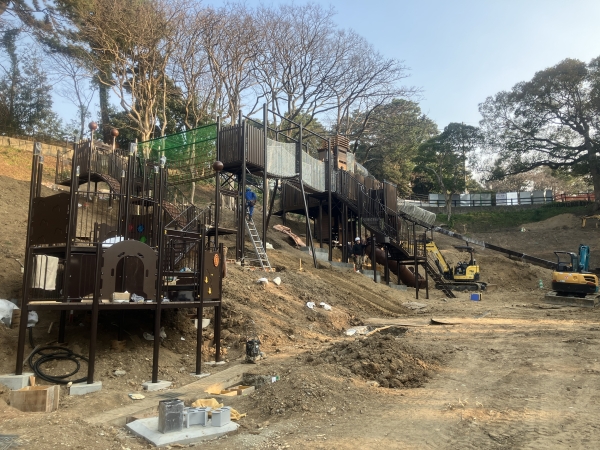 現在、西公園の大規模複合遊具設置工事に弊社も携わっています。遊具1基に対して5工区に分割して工事が行われています。位置や高さ管理が非常に重要になってきます。完成まではもう少しかかりそうですが、出来上がりがとても楽しみです。